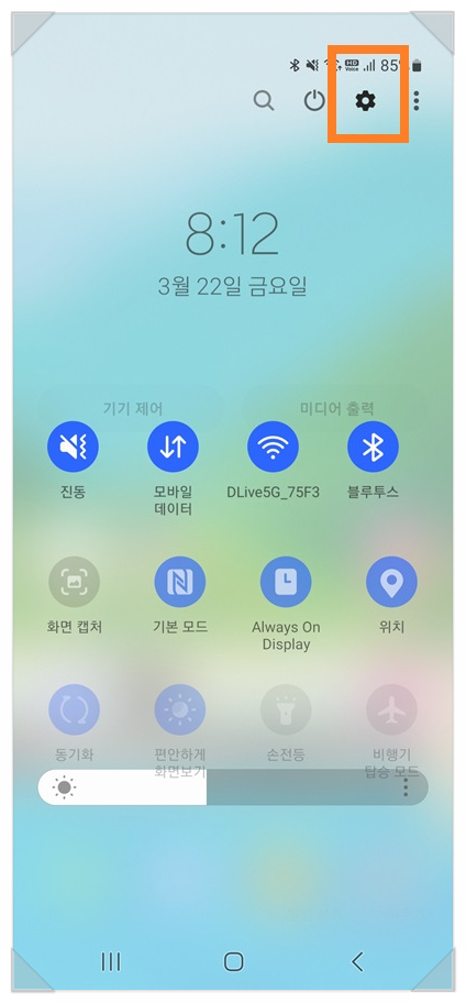 스마트폰 홈 화면 맨 위 상태표시줄에서 아래로 화면을 쓸어내려 알림창을 엽니다. 알림 창 우측 상단에 보이는 톱니바퀴 모양의 아이콘('설정')을 선택합니다.