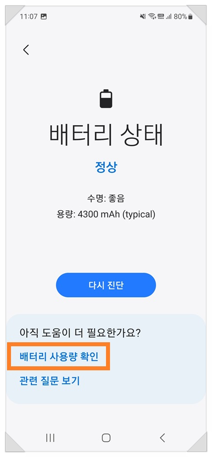 '배터리 상태' 화면에서 '배터리 사용량 확인'을 선택합니다.