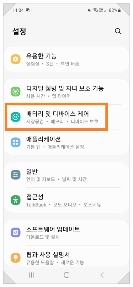 '설정'화면에서 '배터리 및 디바이스 케어'를 선택합니다.
