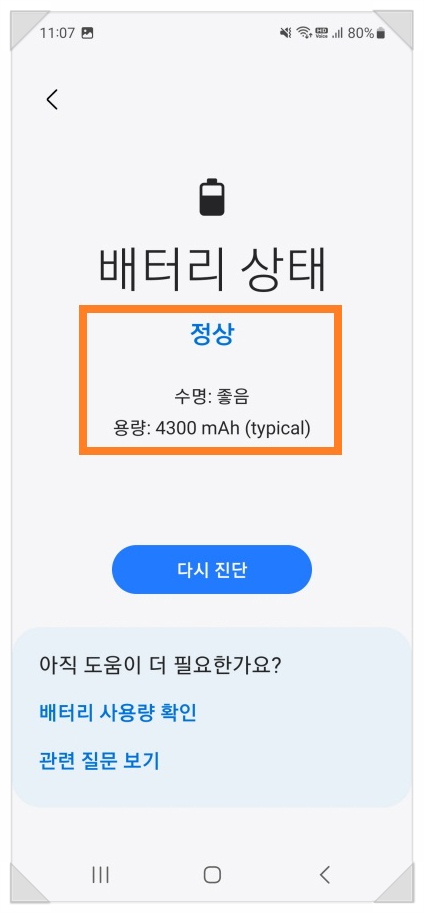 배터리 상태를 확인합니다. '정상'이면 다행이지만 '나쁨'이라고 나오면 배터리 교체를 검토해 보셔야 합니다.