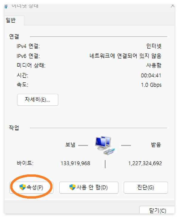 [5] 속성 화면에서 '인터넷 프로토콜 버전 4(TCP/IPv4)'를 선택합니다.