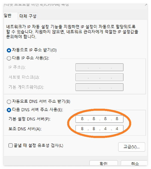 [6] '인터넷 프로토콜 버전 4(TCP/IPv4)' 화면을 보면 기본 설정이 '자동으로 DNS 서버 주소 받기'로 되어 있습니다. '다음 DNS 서버 주소사용'을 선택하고, 기본 설정 DNS 서버를 '8 8 8 8'로 보조 DNS 서버를 '8 8 4 4'로 설정합니다. '8 8 8 8'과 '8 8 4 4'는 구글의 공개 DNS 서버 주소입니다. 설정 후 '확인' 누르고 빠져나갑니다.