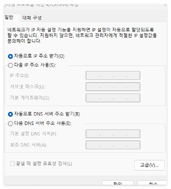 특정 사이트만 접속이 안되는 경우는 DNS를 제대로 찾지 못했기 때문이라고 하므로 DNS 서버 주소를 수동으로 설정해 보니 효과가 있었습니다. 다른 방법을 다 해봐도 안될 때, 아래 설명처럼 DNS 서버 주소를 수동설정하는 방법을 한번 시도해 보시기 바랍니다. 윈도 11을 기준으로 하였지만 다른 버전에서도 방법은 동일합니다.