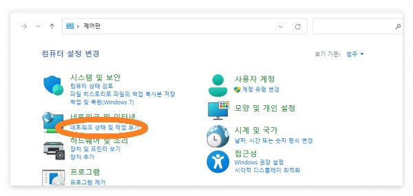 [2] '제이판' 화면에서 '네트워크 및 인터넷' 아래 '네트워크 상태 및 작업 보기'를 선택합니다.